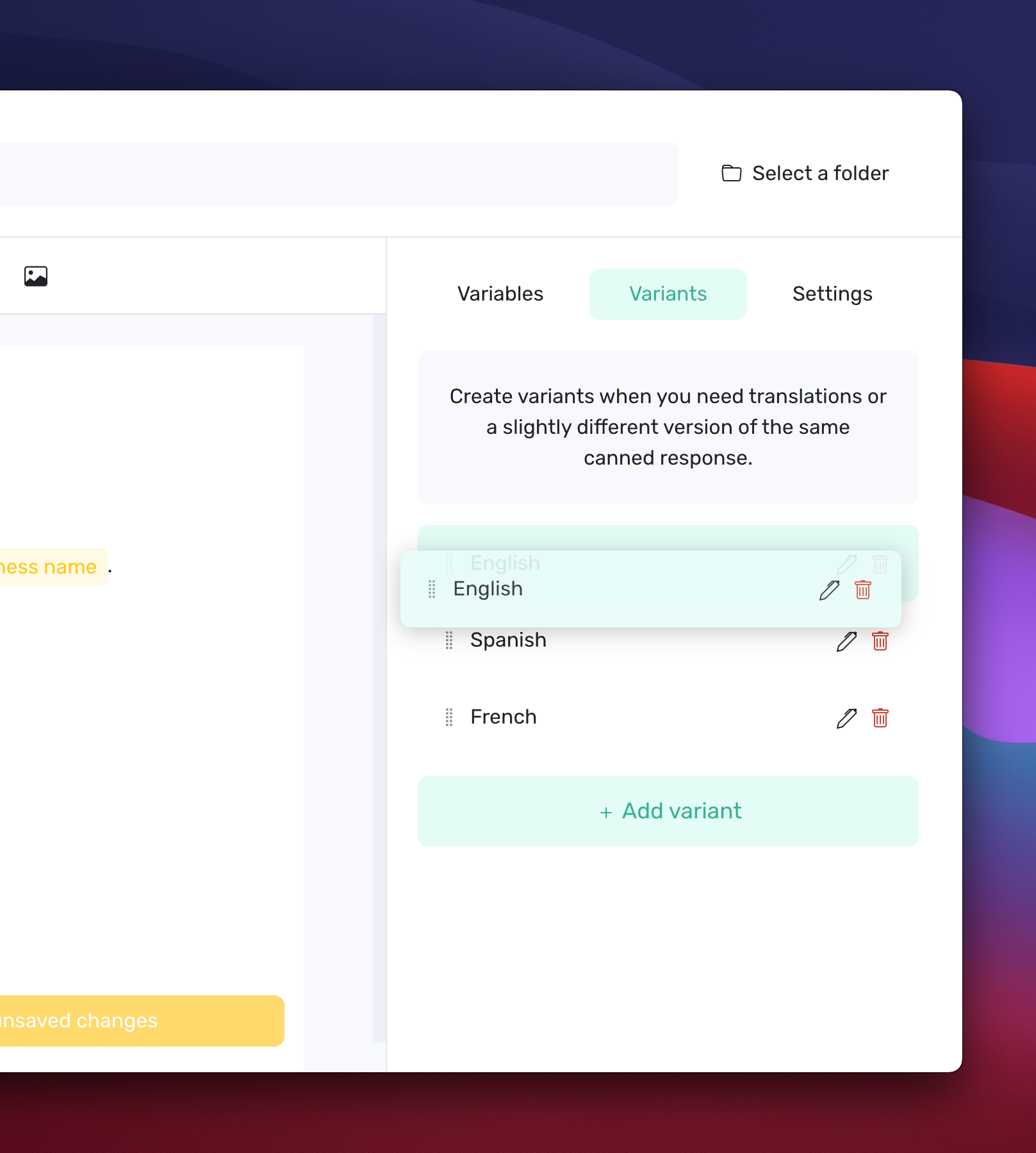 Variants are a great way to organize different versions of the same canned response (like translations, or steps). You can now reorder them as you want.