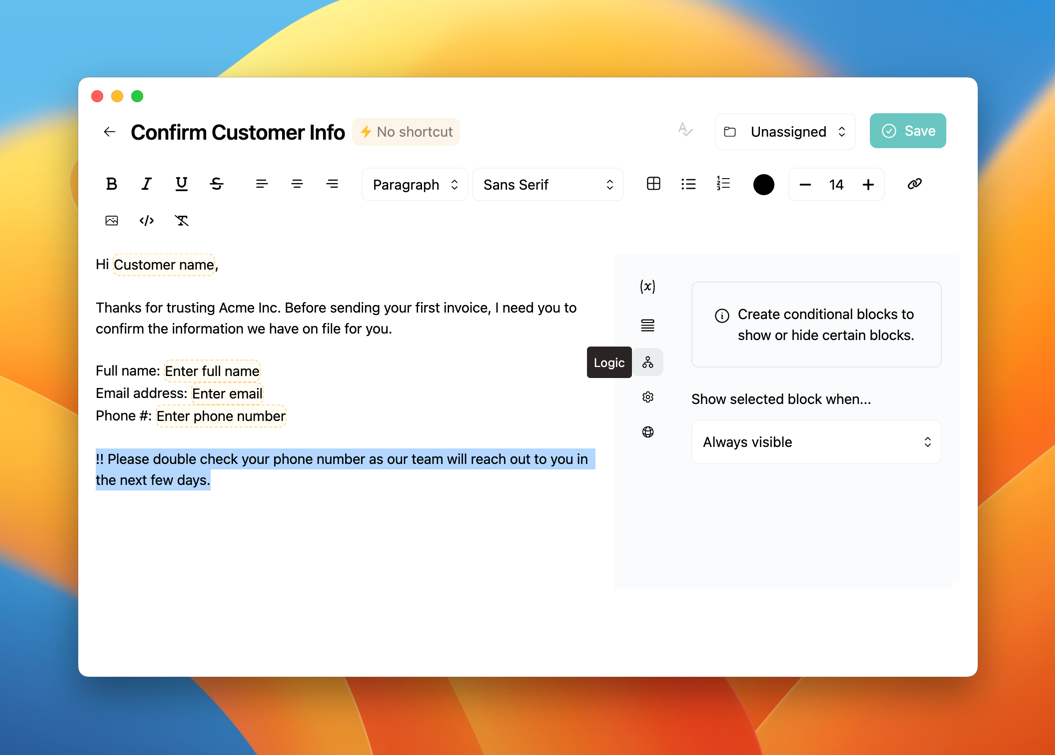 Logic Blocks are powerful ways to dynamically show or hide parts of your template based on certain conditions. Let's demonstrate this with a specific example.