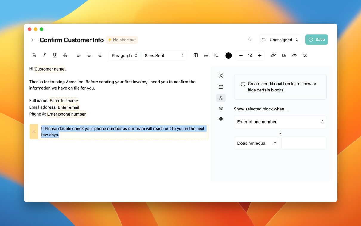 Now, try out your template: when the phone number is empty, the logic block is not added to your template.