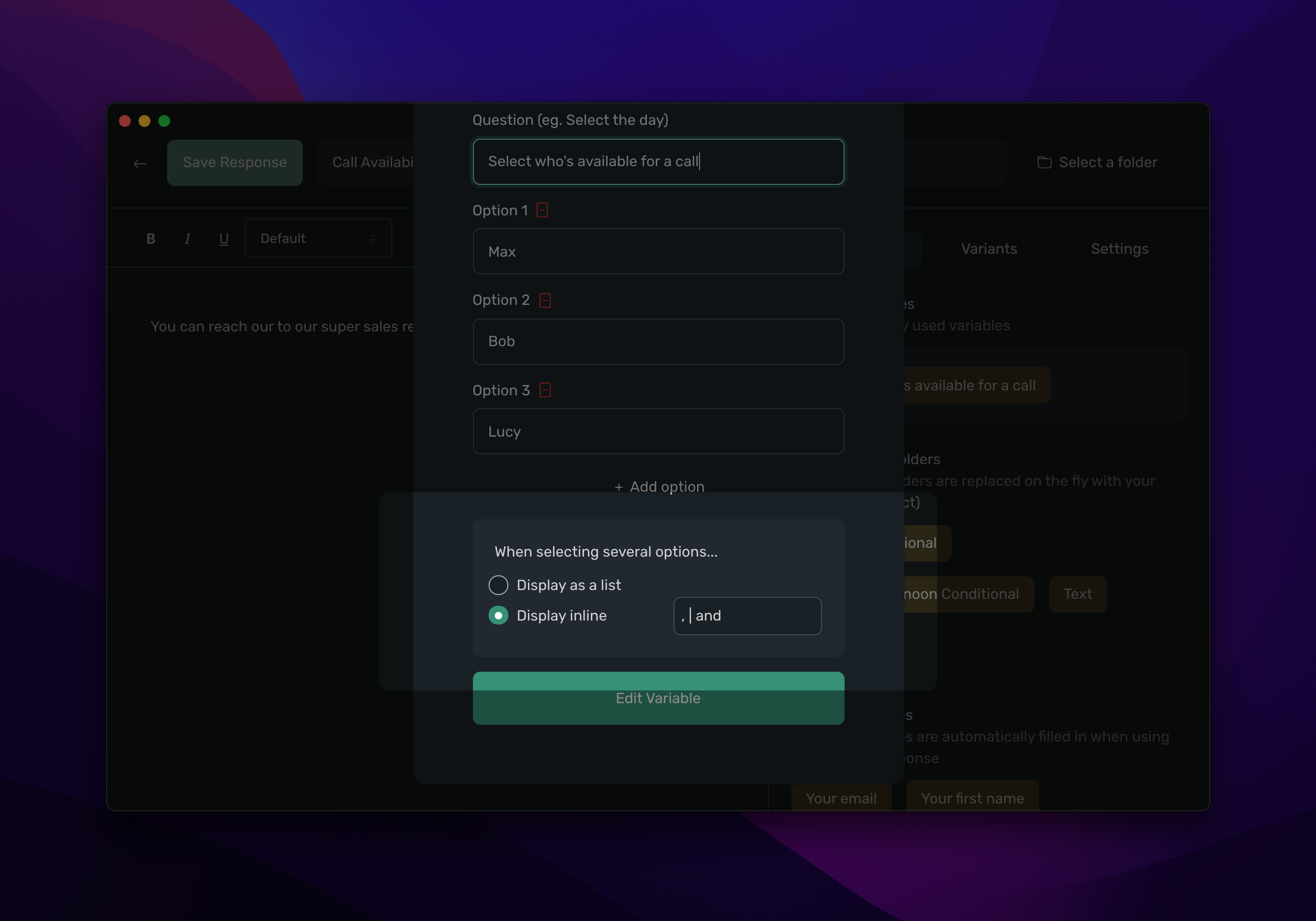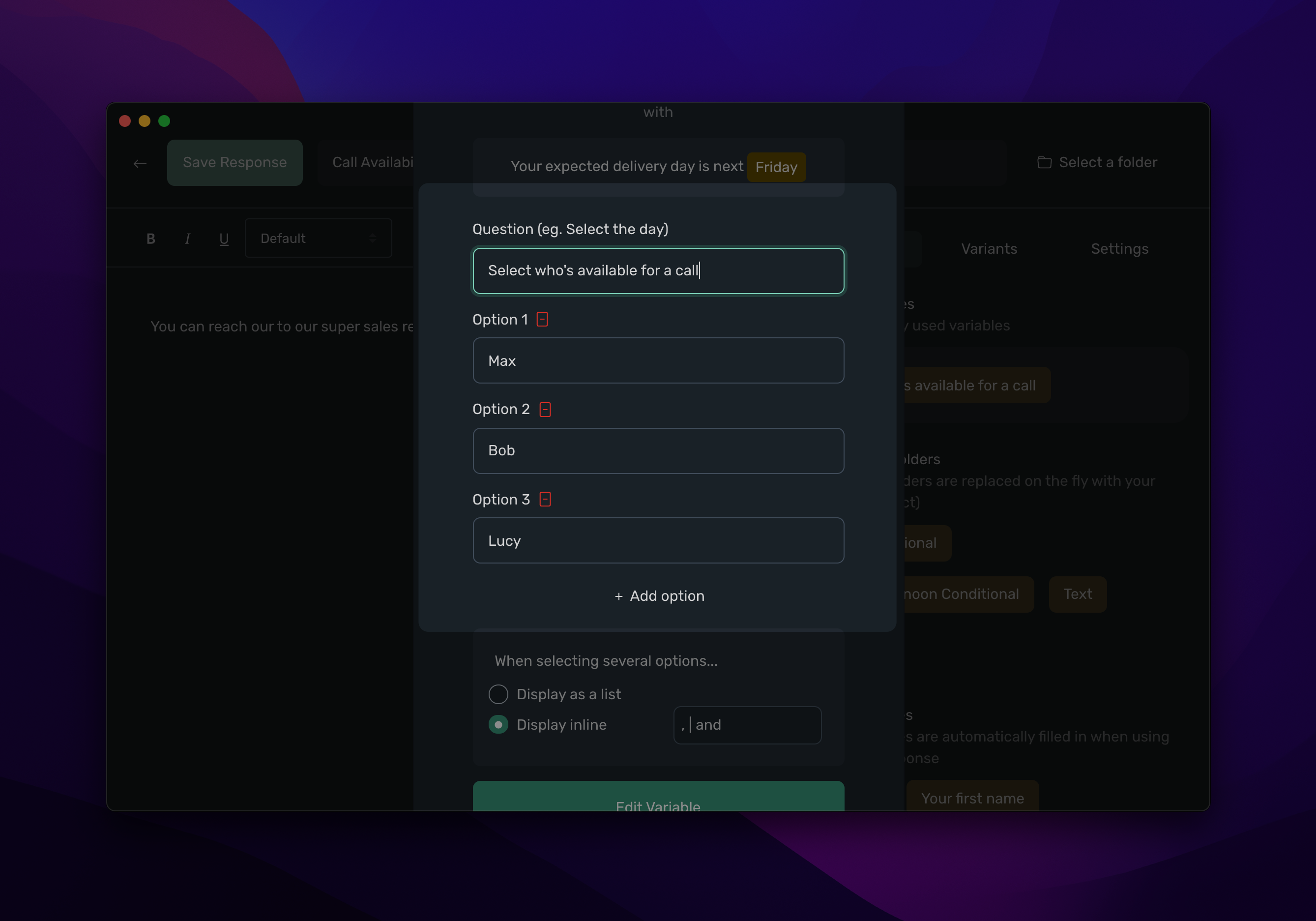 When setting up your multi-select variable, you can select how you want typedesk to display it in your canned responses, either as a list or grouped together with a character. For instance, you can select , to display Max, Bob.