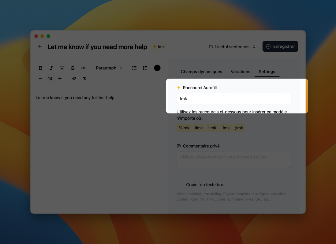 For each template you create, you can assign a text shortcut allowing you to quickly insert any template. For instance, if you assign eml to your email address, you simply need to type %eml to insert your email address.