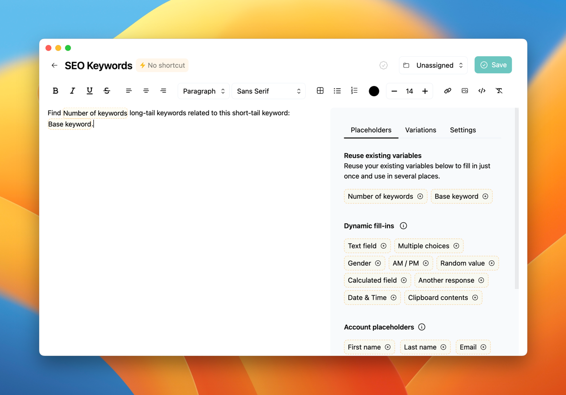To create your prompt, simply open the template editor and use it as you would any other template. Variables can be used to transform a simple prompt into a dynamic and robust one that can be easily customized each time. For example, if you wish to generate a list of N keywords that relate to your initial keyword, the format would appear like this: