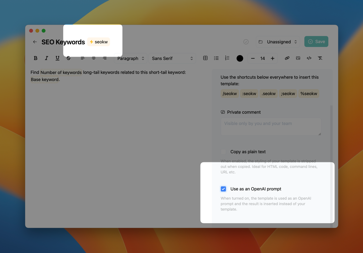 Although the built-in AI shortcuts are useful for beginners, you may discover that your business requires more customization. For instance, for SEO purposes, you might need to identify related keywords from a single base keyword. This is where custom prompts come in! Let's explore how they work.