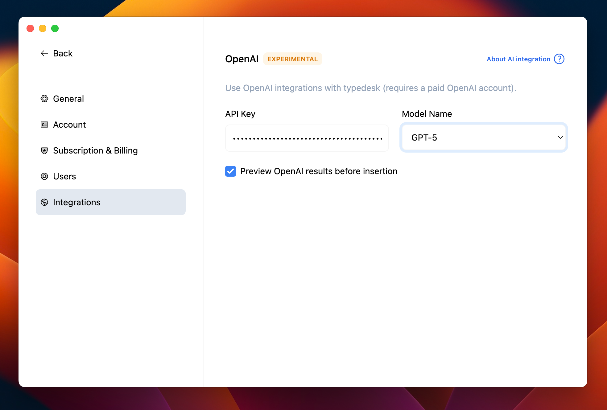 At typedesk, we believe in keeping things transparent when it comes to pricing. We don't charge any additional fees for using ChatGPT in typedesk. However, you will need to add your API key in the preferences to fully utilize the ChatGPT features.