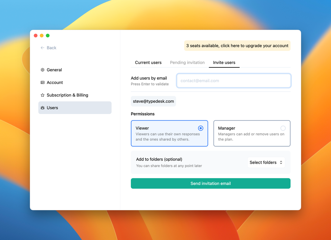 Optionally, you can select one or more folders on your plans you want to give those users access as soon as they accept your invitation.